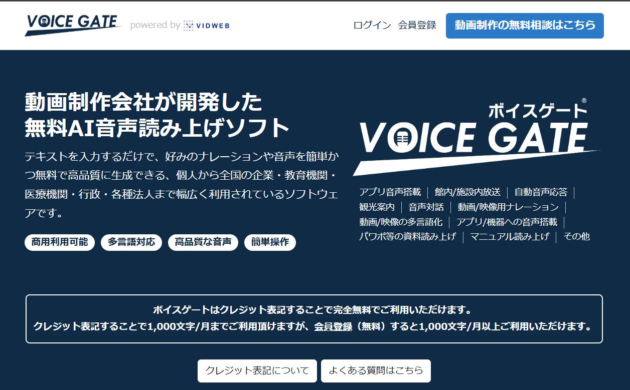 ボイスゲートは、完全無料で利用できる音声読み上げツールです。