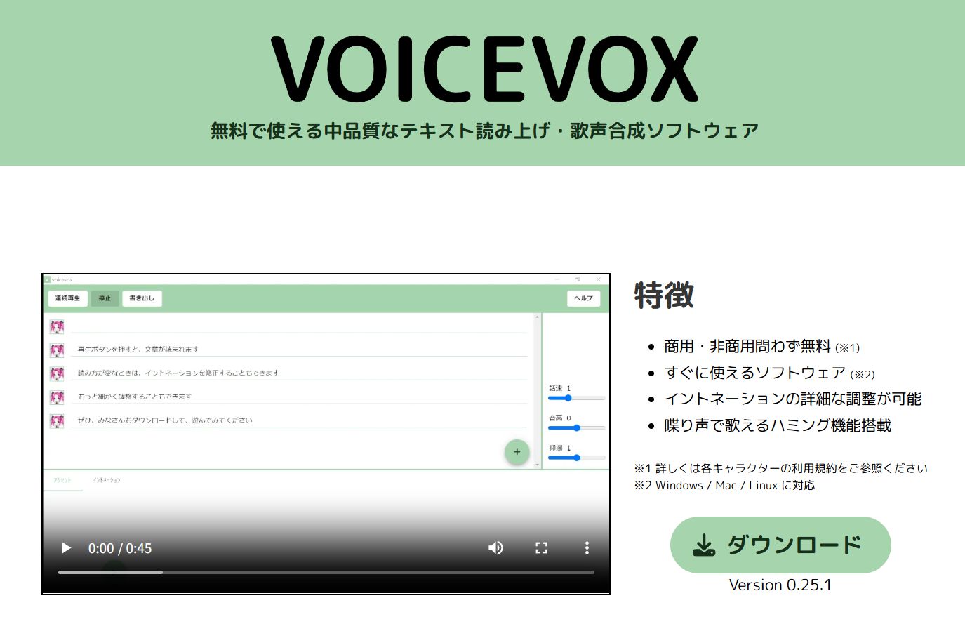 | VOICEVOX | 可能 | 日本語 | 可能(クレジット必須) | Windows、Mac、Linux | MP3 | キャラクター30種類以上。文字数制限なく無料。イントネーション・抑揚など細かい調整可(規約はキャラごとに確認)。 |