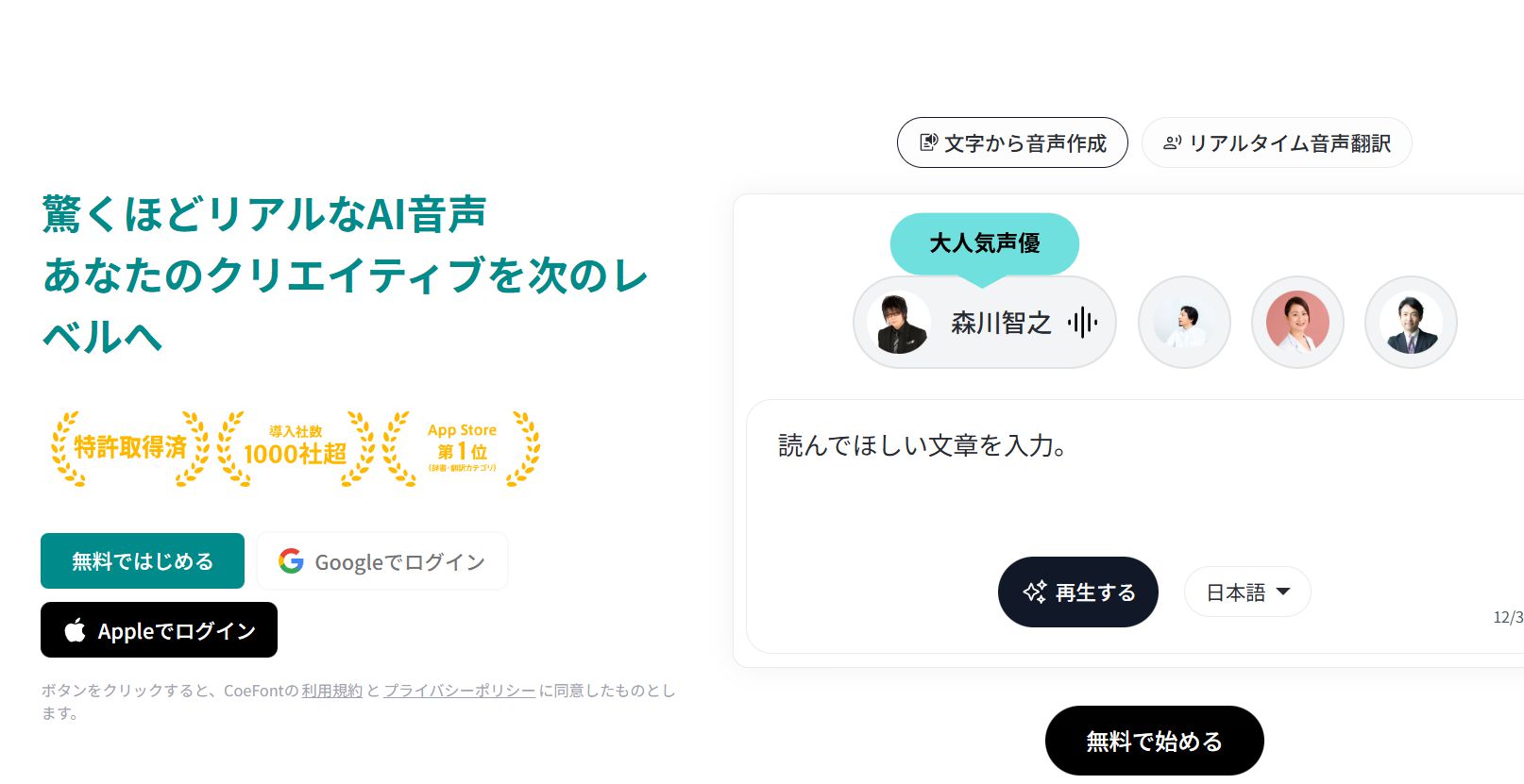 キャラクターは30種類以上から選択でき、文字数制限なく無料で利用できます。