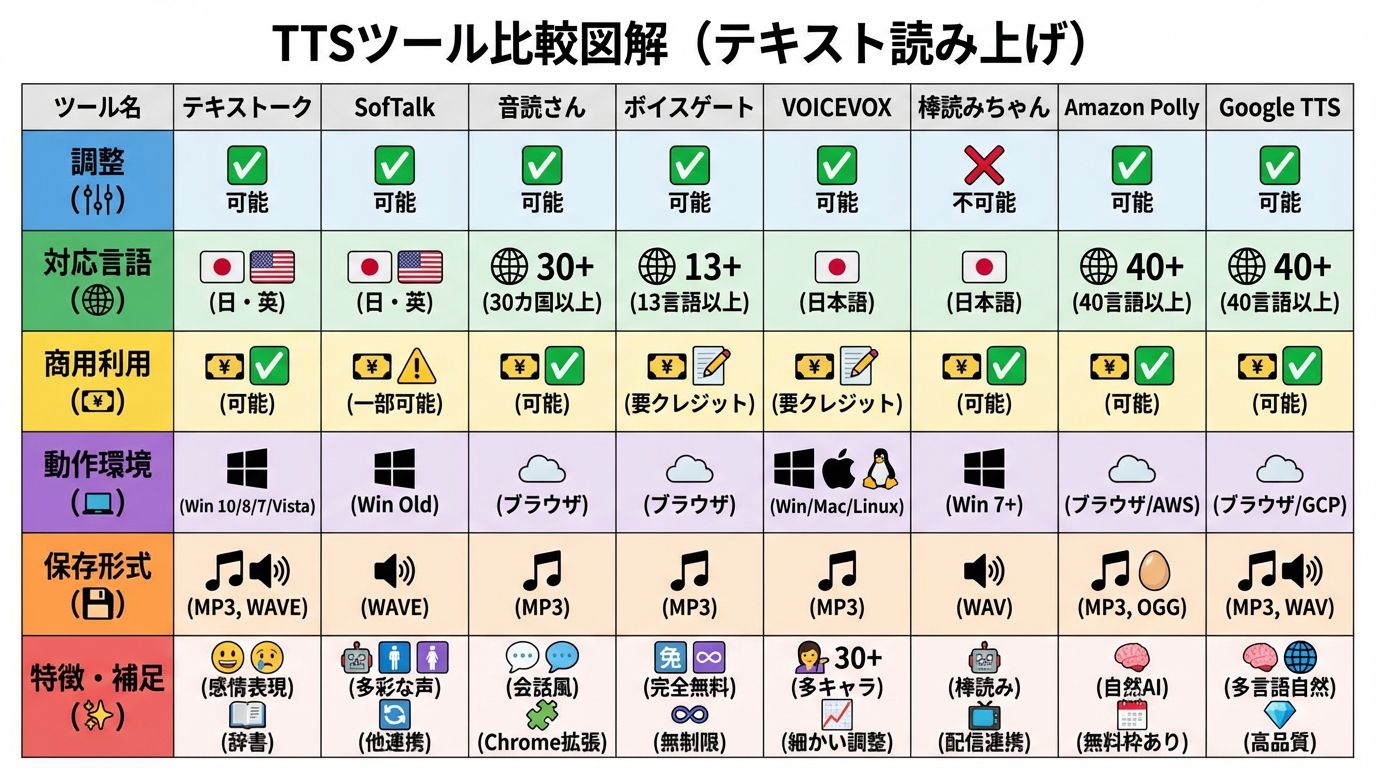 | Google Text-to-Speech | 可能 | 日本語・英語を含む40言語以上 | 可能 | ブラウザ利用 | MP3、WAV | 多言語で自然な音声。日本語は男性・女性の複数音声。Standard/Neural音声は文字数制限ありつつ無料利用可。 |